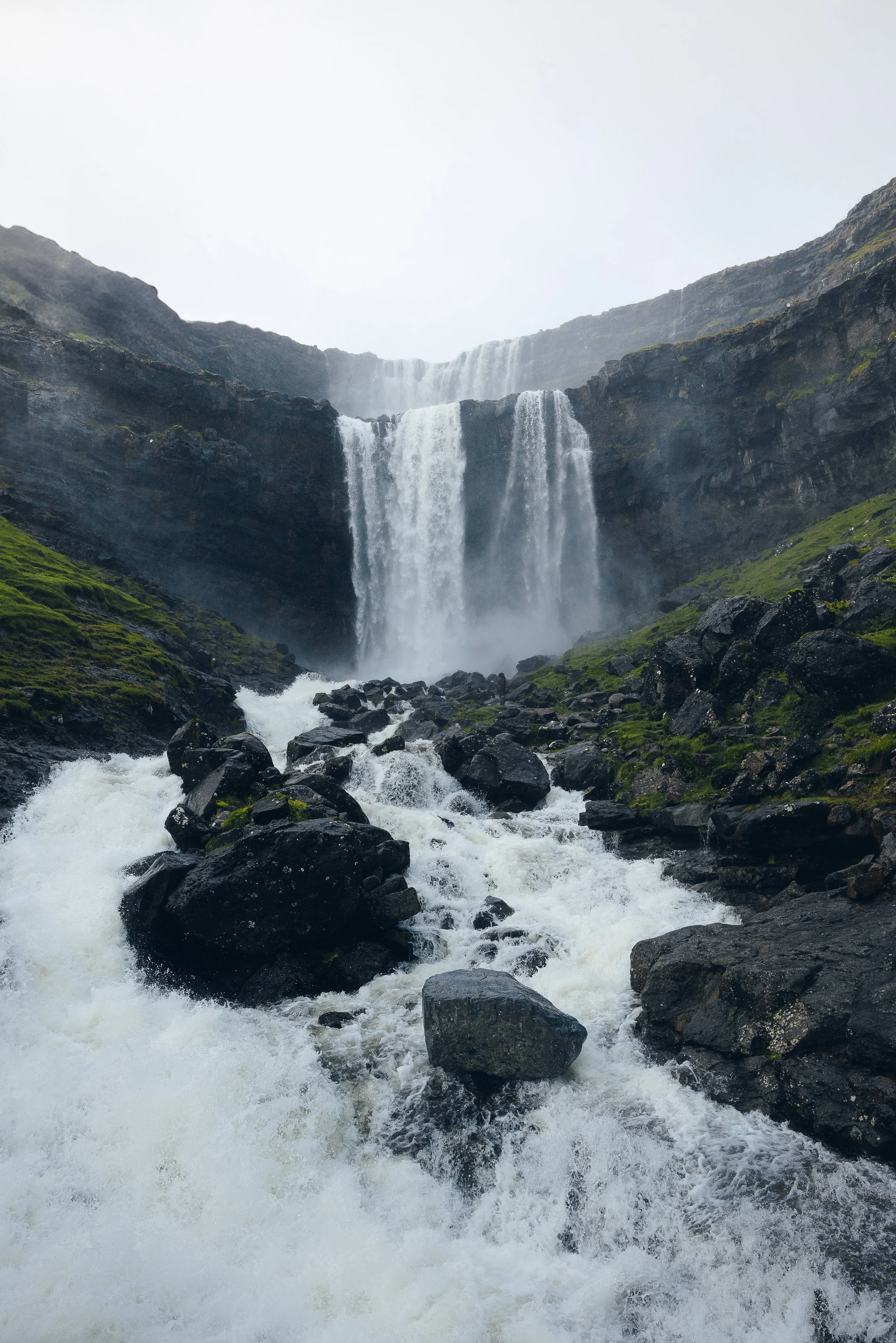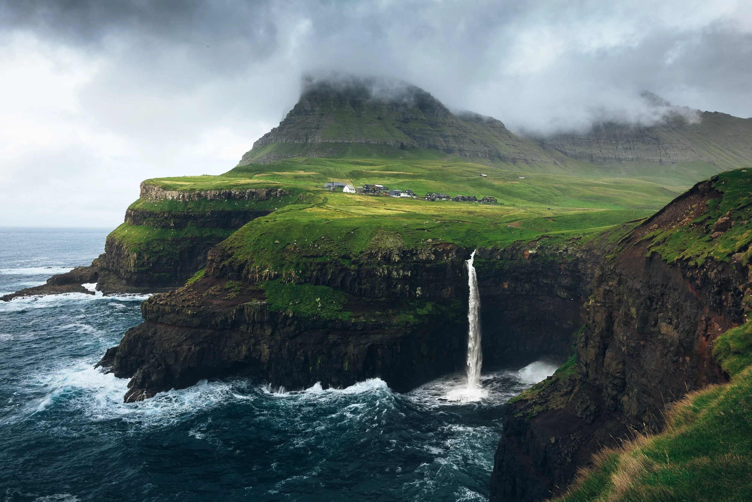 In the afternoon, we head to Streymoy, visiting the peaceful, turf-roofed village of Saksun, then on to the powerful two-tiered Fossá waterfall, and finally the black-sand beach at Tjørnuvík, where the towering sea stacks Risin & Kellingin await under the shifting evening skies.